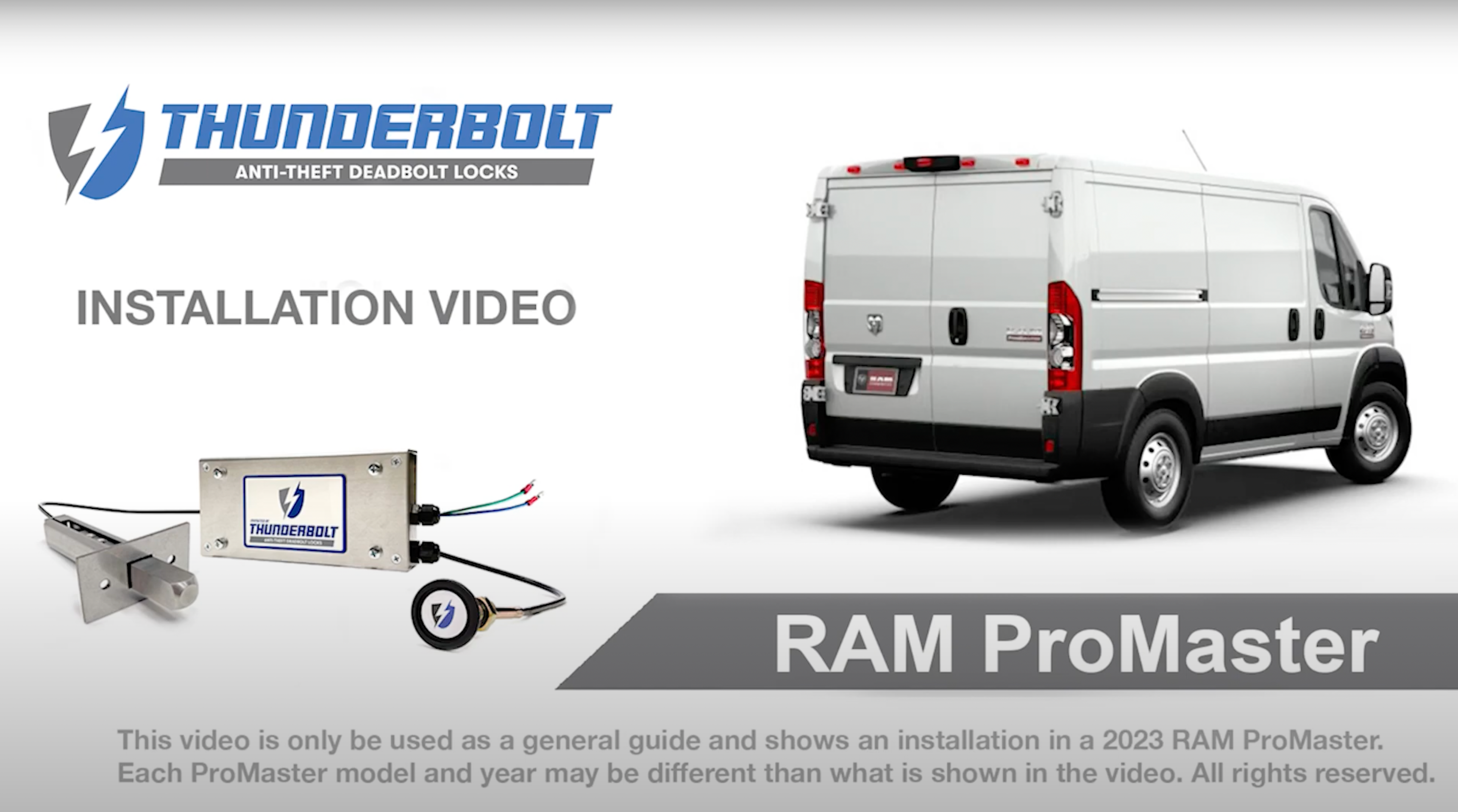 Thunderbolt Locks are compatible with all ProMaster models. Below, select the number of doors you want to secure and either M1 or M2 locks to see the recommended equipment. M1 locks operate from your vehicle’s key fob, while M2 locks use a Thunderbolt key fob.